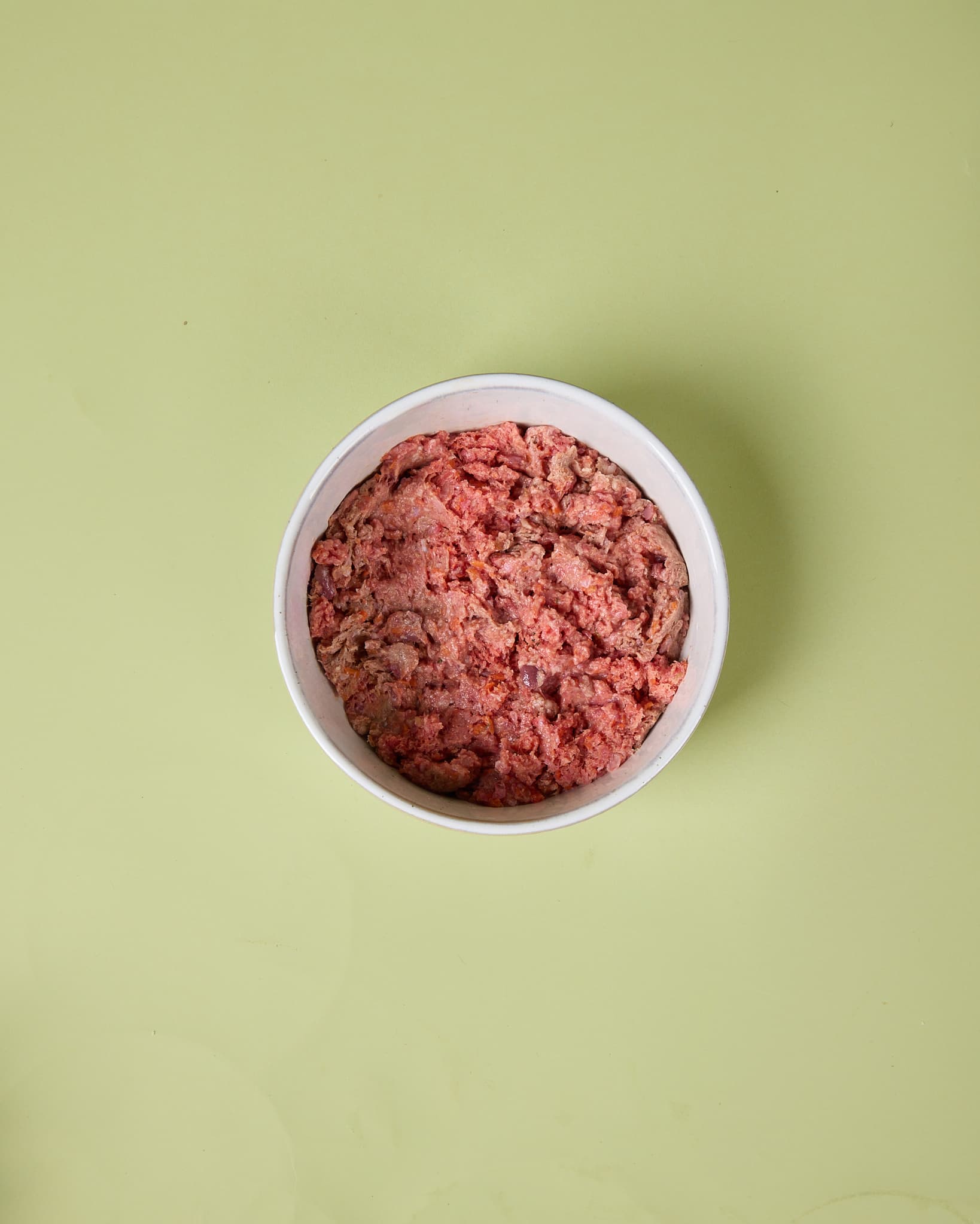 Chicken BARF mix with premium raw chicken, chicken bone and cartilage mix, 10% organ meat mix, seasonal fruit and vegetables, eggs and a small amount of carefully controlled garlic blended together and finely minced. Seasonal fruits and vegetables typically include carrot, celery, zucchini, apple, and sweet potato. Nutritionist formulated to provide a nutritionally balanced and delicious meal.
